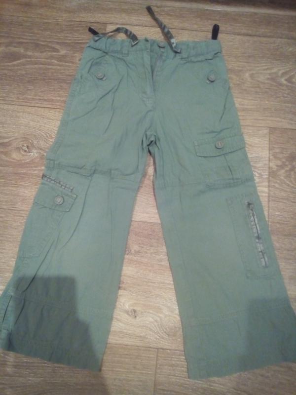 Стильные штаны на девочку 4-5 лет. Ширина пояса регулируется. Карманы отделаны атласной лентой в тон штанам. Без дефектов.