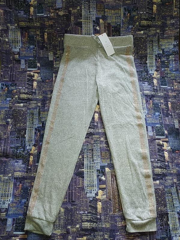 Тоненькі штанці на манжетах на дівчинку, м'яка тканина, талія на резинці, шнурок не затягується, знизу трошки криво приклеєні стрази (3 фото) Вказаний розмір 10. Склад 97 поліестер 3 еластан. Заміри довжина 77, шаг 57, нот по резинці в спокійному стані 30,5, нос 35.