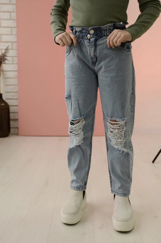 Трендові моми ,пояс на резинці, хороший якісний денім, тканина не тягнеться. Розмір: 9, 10. 11 Заміри⬇️⬇️⬇️ 9р пояс 22 довжина 76 шаг 54 бедра 40. 10р пояс 24 довжина 78 шаг 55 бедра 41. 11р Пояс 25 довжина 80 шаг 55 бедра 42.