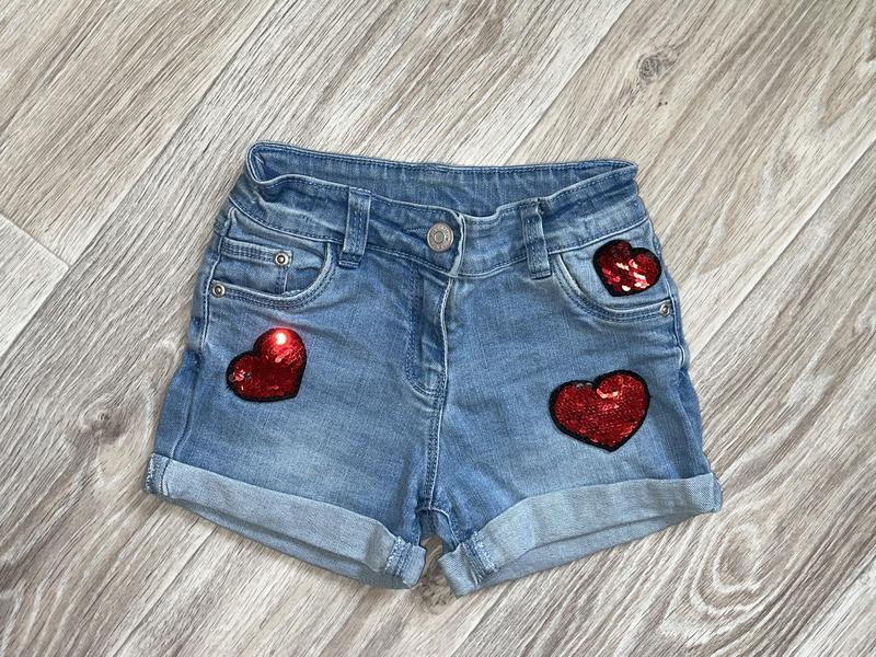 Шорты с нашивками сердца Пайетки перевертыши Сзади 2 кармана В талии утяжка Состояние идеальное без дефектов 🏷TU 6 лет Длина 21. ПОТ 25- утяжка