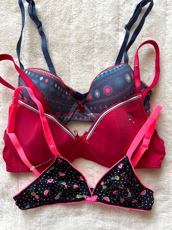 Бюстгальтери для дівчаток Франція Всі нові Виробник Туніс 1. Синій з принтом на чашку В ( чашка плотна ) ширина 58, плюс тягнется 2. Винного кольору на чашку В ( чашка плотна) Ширина 62 плюс тягнется 3. Чорний з принтом Чашка м’яка А Ширина 52 плюс тягнется 179 один