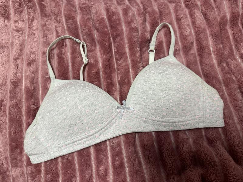 Бюстгальтер для девочки, кажется и не одет никогда, но бирку дочь сняла. Объем от 60 до 66, чашка что-то 0-0,5, чуть меньше А. Серый коттон с розовыми сердечками.