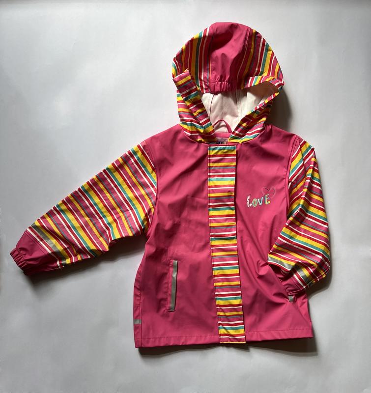 Дощовик на зріст 110-116 см або 4-6 років. Зроблений із щільної водонепроникної та водовідштовхувальної прогумованої тканини. Вітрозахисна планка на липучках. На рукавах, капюшоні та стегнах позаду рефлективна стрічка. Виміри: довжина 50см, ширина під рукавом 40см, рукав 38см. Стан ідеальний.