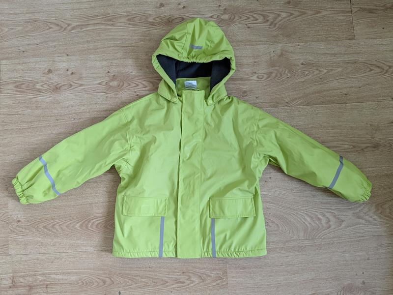 Дуже гарна курька-дощовик на флісі. Не продувае, не промакає, а флісова підкладка не дає змерзнути. На останньому фото видно невеличкий дефект, в іншому стан ідеальний. Розмір 122-128. Фірма: impidimpi