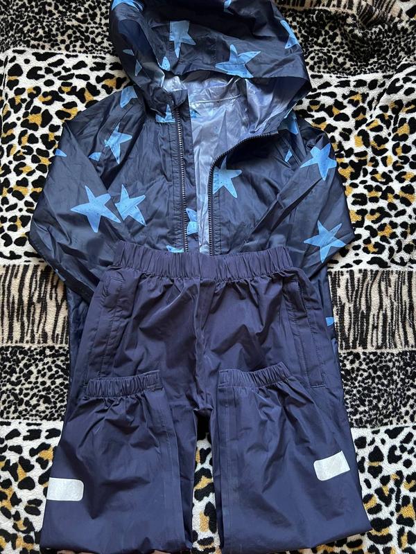 детский комплект дождевик для девочки 4-5 лет Длина штанов внутр шов -40 см внешний шов -62 см талия 52 см на резинке ( полуобхват -26 см ) дождевик рукав от горловины 42см об гр 35см полуобхват внутри кофты подпись фломастером не получилось вытереть
