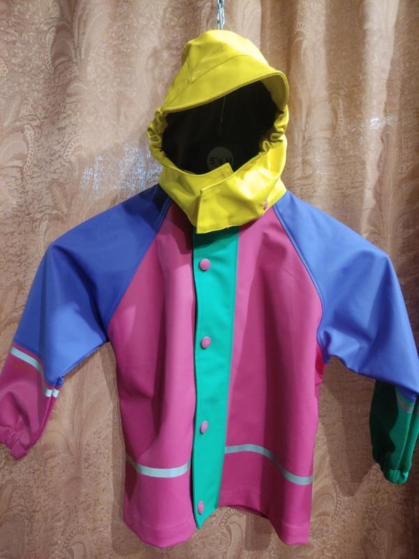 Куртка детская на дождь летняя, демисезонная. Отличный выбор для активного отдыха и прогулок в непогоду. Плотная ветро-влагозащитная прорезиненная ткань. Капишон отстегивается. Подкладка - синтетическая ткань, приятная на ощупь. Без утеплителя. Фурнитура, замки, резинки, липучки - рабочие. Замеры длина - 44, подмышками - 43, талия - 40, по низу - 40, рукав от шеи -45, рукав от подмышки -28. на куртке есть светоотражающие ленты.