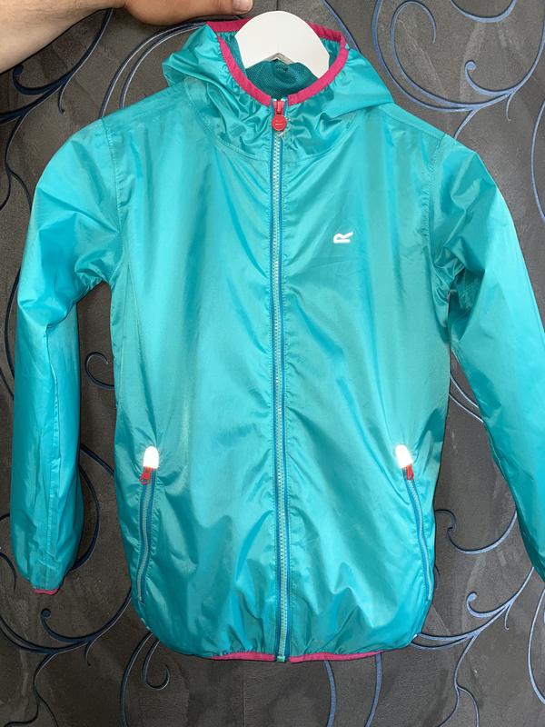 Новая куртка дождевик ярко бирюзового цвета. Непродуваемая, непромокаемая, капюшон от ветра. В кармане сумочка, в которую складывается ветровка, не занимает много места. Размер 9/10 лет рост 140