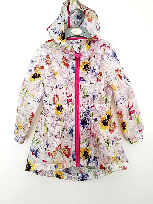 Ветровка-дождевик удлиненная, с капюшоном, с большими удобными карманами, внизу куртки резинка, чтобы не поддувал ветер, застегивается на молнию. Резинка также внизу рукавов и на поясе. Объемная, можно много под нее надеть, даже пальто. Куртка без утиплителя и подкладки, только одна верхняя ткань - водоотталкивающая и хорошо защищающая от ветра. Ткань 100% полиэстер, не толстая, но качественная. На возраст 2-3 года. Длина 48, плечи 30,5, рукав 34, ПОГ 37. Идеальное состояние, лишь немного откололась эмаль от сердца-бегунка на молнии (не более 1 мм в 2-х местах). Смотрите все мое объявления.