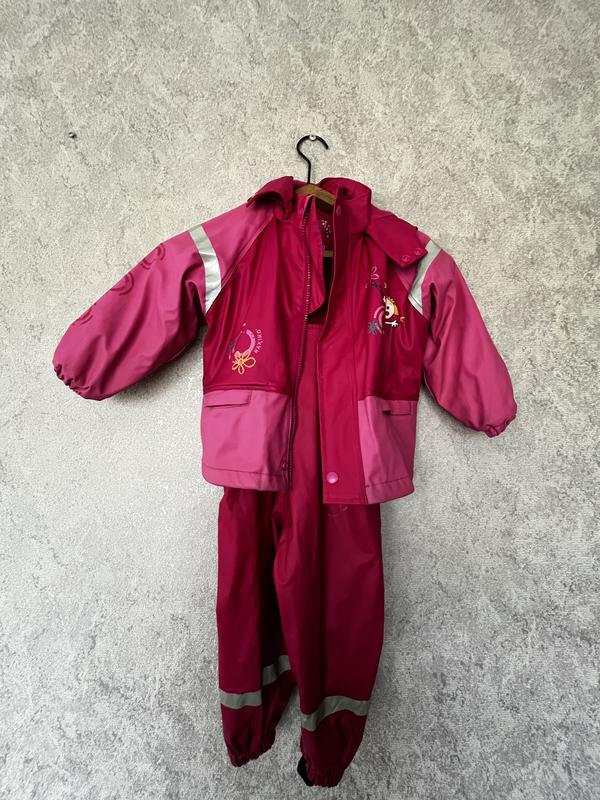 Грязепруф: курточка і комбінезон непромокаючі. В гарному стані, без дірочок. Є невеличка пляма в середині на підкладці і відірвалися резоночки, які мали надягати я поверх чобітків. Гумові чобітки ціленькі, в чудовому стані, розмір 23