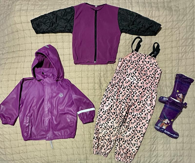 Дуже практичний комплект для дощової погоди. Можна носити на різний температурний режим: - як домі курточку прорезинену - як флісову курточку окремо - як дощовик на флісі. Розмір 3-4 роки (98-104 см) Напівкомбінезон прорезинений в леопардовий принт на підкладці з полієстеру бренду TU (Англія) - 350 грн. Чобітки 24 розмір (15 см по устілці) на хутрі нові - 300 грн. На прорезинений курточці є невеликі тріщини (останні 3 фото), флісова курточка без недоліків. Ціна вказана тільки за курточку. Якщо курточка з штанами 450 грн