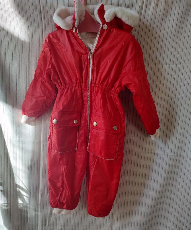 Детский комбинезон-дождевик, утепленный внутри флисом. С капюшоном, который снимается. Берка отсутствует, поэтому ориентируйтесь по замерам. Замеры: длина - 68 см, ПОГ - 29 см, длина рукава - 31 см, шаг - 25 см. Эффекты - немного разошелся шов на рукаве и есть несколько пятен (на фото видно)