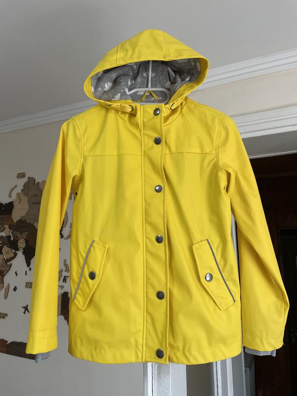 Куртка для дівчинки водонепроникна жовта Alive в ідеальному стані. Єдиний нюанс це незначна плямка на рукаві,яка при носці абсолютно непомітна. На останньому фото показано. Розмір на бірці 134-140. Заміри: Півобхват грудей 41 см. Довжина рукава 50,5 см. Довжина куртки 58 см. Куртка-дощовик для маленької модниці. Куртка з бавовняною підкладкою. Застібається на блискавку, додатково є кнопки. По боках дві кишені на кнопках. Рукава з манжетами. - щільна тканина з пропаяними швами; - водовідштовхуюча і вітронепродувна; - глибокий капюшон; - світловідбивачі на кишенях. Склад: 100% поліестер.