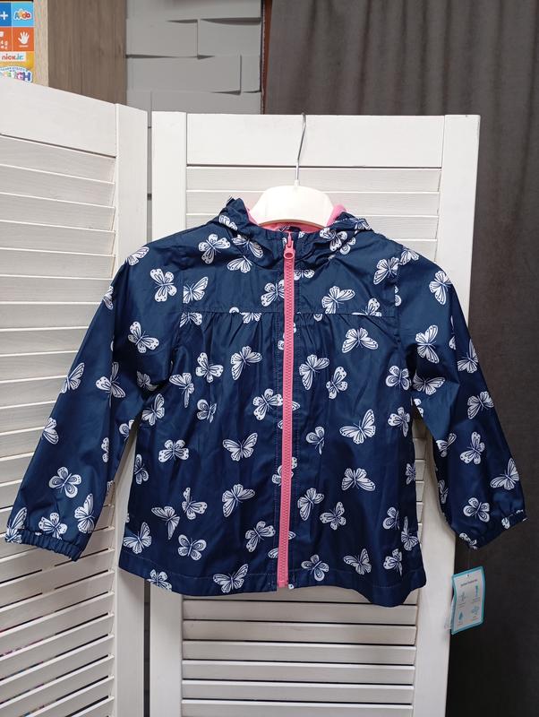 детская ветровка (дождевик) от Carter's выполнена в синем цвете с принтом в виде белых бабочек и оснащена ярко-розовой застежкой-молнией.