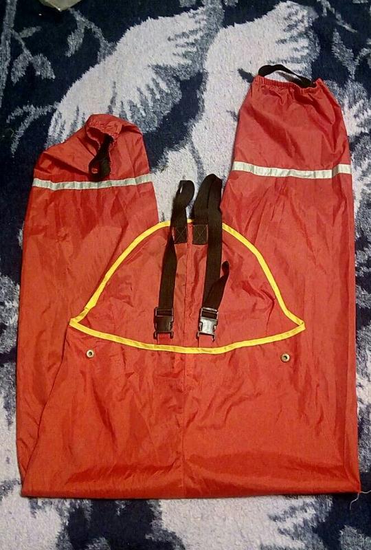 Червоні штани на підтяжках.На штанках внизу - світловідбивні смужки.Закрита спина.Застіібки зпереді. Можна носити поверх теплих спортивних штанів 👉 +5грн (за пакування і % шафі )