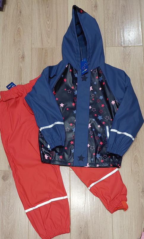 Яркий, красивый, теплый и качественный комплект-дождевик от Lupilu Внутри куртка на флисе штаны без флиса Размер 122-128 куртка длина 53 Рукав от горловины 55, от подмышки 39 пог 41 штаны длина 76 Шаг 54 Пот 28