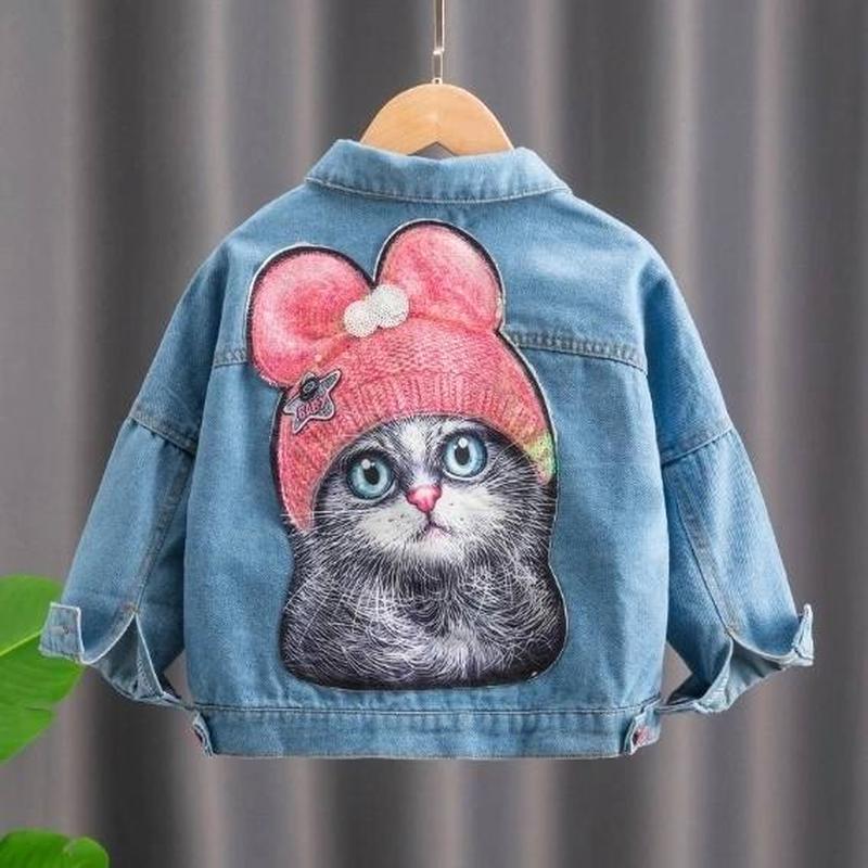 ✍🏻Стильна джинсовка з котиком ✍🏻 матеріал джинс ✍🏻замір рукава від горловини ✅ЗАМІРИ ✍🏻110р - довжина 34см, ширина 39см, рукав 43см; ✍🏻120р - довжина 35см, ширина 40см, рукав 45см; ✍🏻130р - довжина 39см, ширина 41см, рукав 48см; ✍🏻140р - довжина 42см, ширина 43см, рукав 51см; Ціна 630 грн