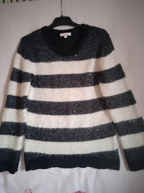 Очень красивый джемпер черная полоска меланж с пайетками белая - пушистая. К сожалению, камера не передает всей красоты. Длина. 57 Длина рукава 57 НПОГ 38 НпОС 39 Приятно тянется.