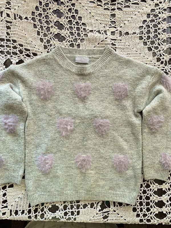 Мягкий светло-серый джемпер на 7-8 лет с пушистыми сердечками. В хорошем состоянии. Состав - 68% акрил, 31% полиэстер, 1% эластана. Довжина 44 см., ширина по плечах 41 см., довжина рукава - 36 см.