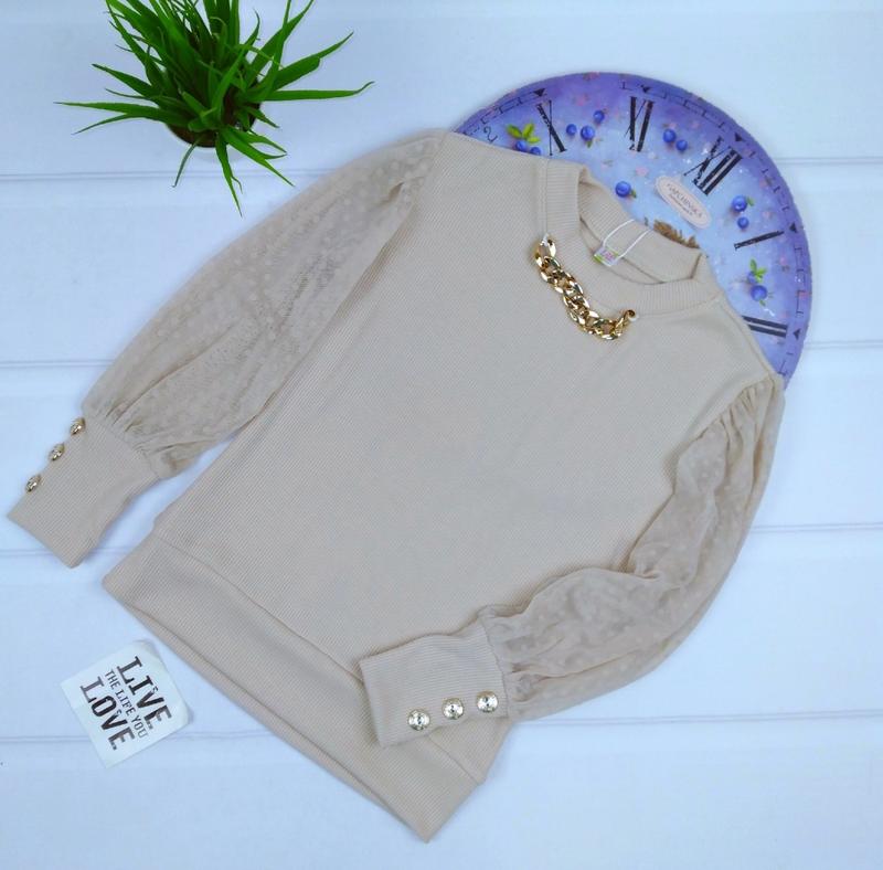 Невероятно стильная кофточка 🤩🤩🤩 Изюминка - очень крутые рукавчики 🦋 Широкие манжеты с пуговицами и сеточка в горох 🦋 Украшение - трендовая цепочка 💫💫💫 Тканина: мустанг-рубчик Производитель: Украина 🇺🇦 ✔р.134-1шт ✔р.152- 1шт ✔р.158-1шт ЗАМІРИ ⤵ +/- 1-2см!!! ◾ р.134- длина 47см/ рукав 48см/ ПОГ 36см ◾ р.152- длина 51см/ рукав 56см/ ПОГ 40см ◾ р.158- длина 51см/ рукав 57см/ ПОГ 42см