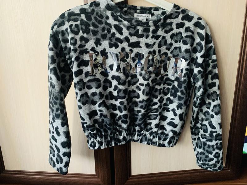 Кроп-джемпер в отличном состоянии на 8-9 лет. Анималистичный принт, снизу на резинке. Тонкий, мягкий и приятный трикотаж. Состав 96% полиэстер и 4% эластан. Декор - зеркальные наклейки-надпись.