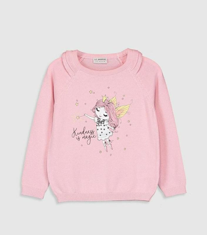 Розовый джемпер с феей от waikiki. Состояние очегь хорошее. Из нюансов на рукава есть по зацепке. На последнем фото показала. На бирке 7-8 лет, мы одевали с 6 лет.
