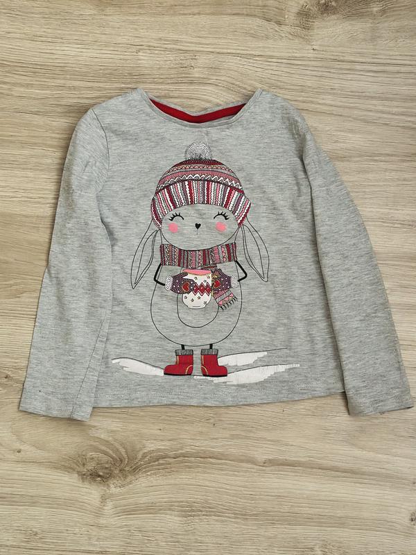 Лонгслив с зимним рисунком на 5-6 лет. Рукав 35.5 см. Снизу чуточку плтрискировался рисунок на фото виден.