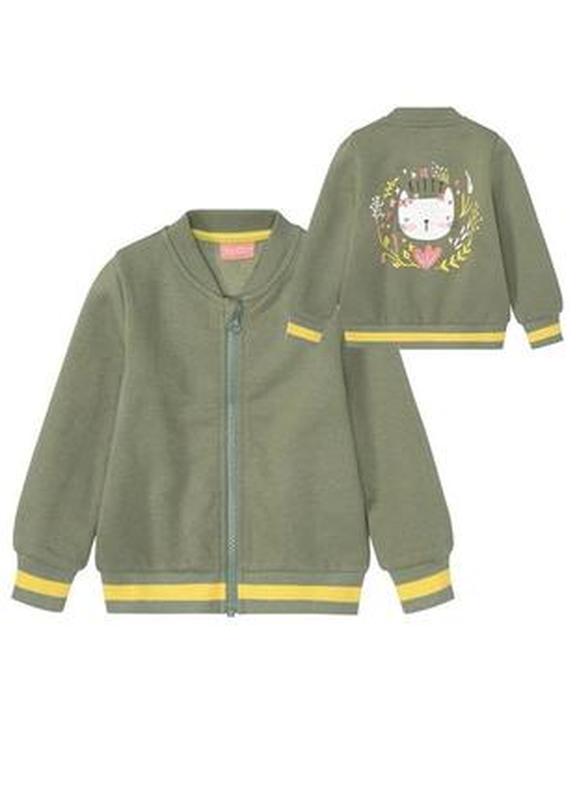 110/116 качество 👍 👍 👍 Бомбер для девочки от Lupilu. На груди принт застежка на кнопки. Есть боковые карманы, низ и рукава на манжетах. Комфорт при носке благодаря хлопку. Ткань двунитка с начесом. Плотный, хорошо держит форму