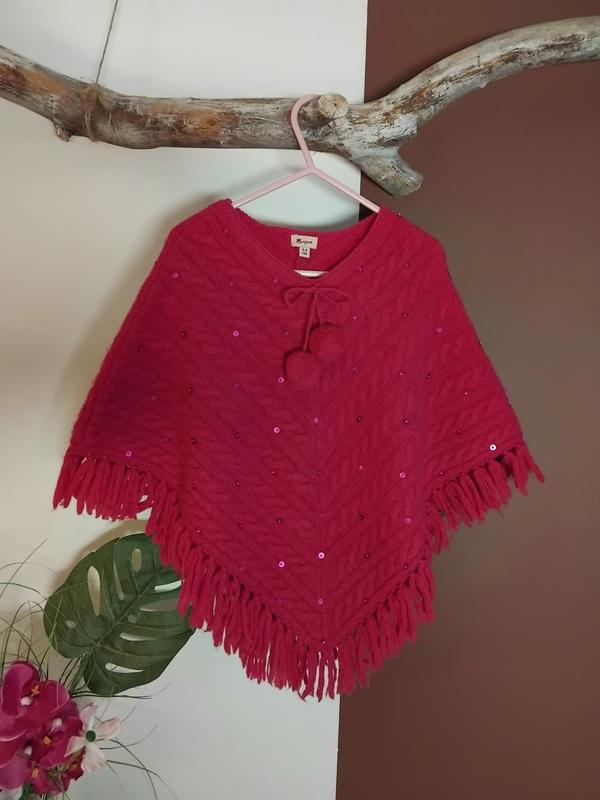 Возраст 3-4 года Состояние идеальное, состояние нового 👍👍👍 Мягкое, теплое и уютное детское пончо Monsoon красивого розового цвета маджента. Оно имеет вязаный узор "косичка", пайетки, кисточки по краю и завязки с помпонами у шеи. Качественная шерстяная смесь шерсть ягненка 70%, ангора 20% и нейлон 10%, что делает его мягким и теплым. Дизайн в виде кейпа. Идеально для дополнительного утепления груди и спинки ребенка, не сковывает движений, по весу не стеснена. Великолепный теплый слой в одежде