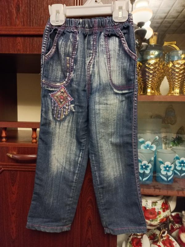 Джинсы на девочку. Возраст 2,5-3,5 года, смотря какой ребёнок. Замеры: пояс резиночка, посадка 22-22,5 см, шаговый 35 см, длина 56,5 см, ширина внизу 12 см. Состояние идеальное, дефектов нет, пятен нет, дыр нет, потёртостей нет. Впереди два кармана, красивый принт впереди на галоше. Товар пересылаю Новой почтой и Укр почтой.