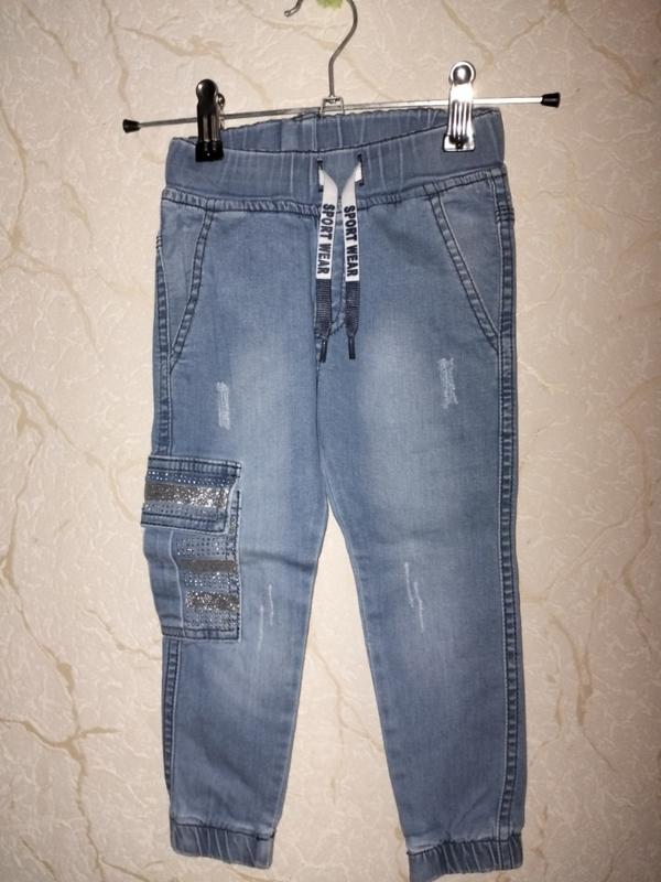 Джинси . Длина 53, ходовая 38. Пояс резинка. Камешки на месте. Одягались 2-3 рази. Очень красивые.
