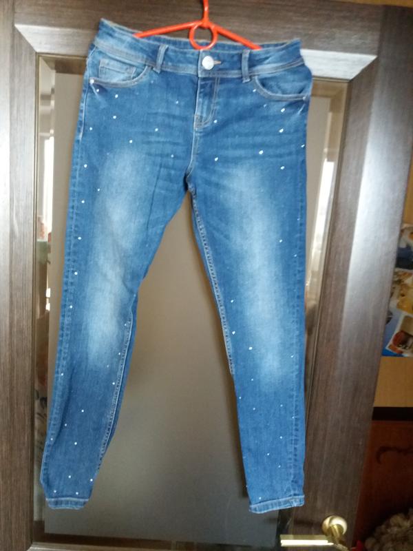 Джинсы со стразами фирмы "Here&There", р.158, материал 99% коттон, 1% эластан. Ширина по линии бедер 41,5 см, длина по боковому шву 88 см. В целом состояние очень хорошее, но несколько стразов отклеилось.