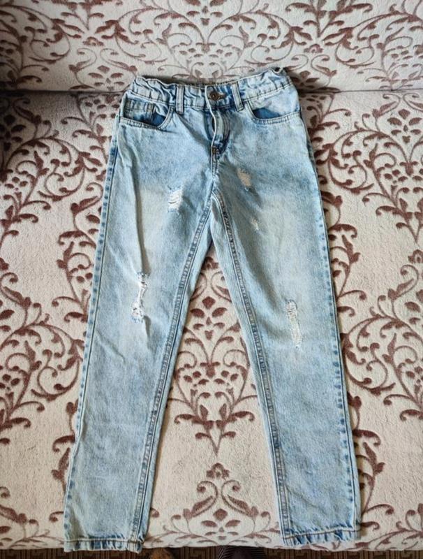 Джинсы голубые зауженные состояние идеальны.8-9 лет.Размер 134.Длина 81см,ШАГ 61см,ширина в поясе 30см,ширина в бедрах 38см.Цина 300гр.