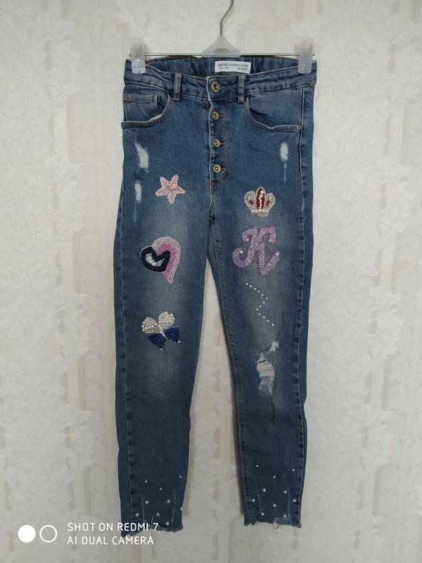Фирменные шикарные джинсы с вышивкой бисером и жемчугом.Состояние идеальное.Высокая посадка.В поясе резинка-утяжка.Застежка-пуговицы.По ширине тянутся Замеры: длина внешнего шага -80см длина внутреннего шага-57см ПОТ-30см высота посадки спереди-22см ПОБ-32см Наложенного платежа и безопасной доставки нет.
