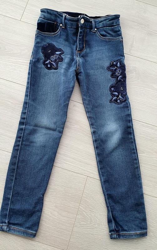 Джинси дуже якісні для дівчинки на р110-116 іспанського бренд з вишивкою та велюром( не наклейка яка перекриває дифекти!!!). На резинці мають регулятор. Стан нової речі.