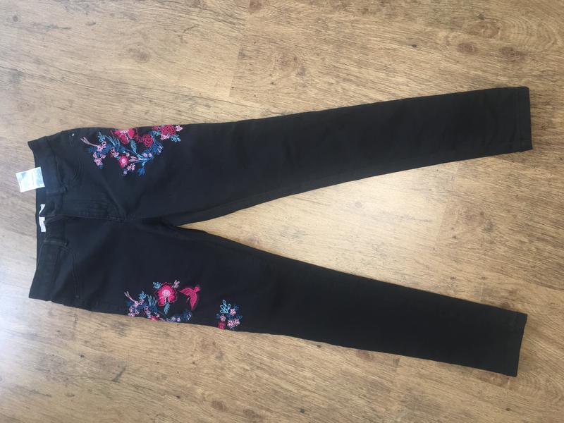 Джинсы скинни с вышивкой, очень красивые, состояние идеальный, стрейч, цвет черный, на высокую худи девочку, замеры : длина - 91,5 см, шаг-67,5 см, пояс -33, посадка -25 см. Передние карманы имитация, посадка высокая. C&A.