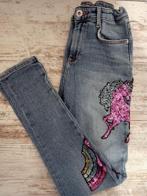 Стильні та яскраві джинси,на дівчинку 11 років.Є ризиночки для стягнення по бокам.