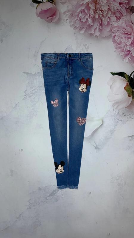 Стильные джинсы с Минни и Микки Маус. На талии утяжка, внизу рваные, тянутся отлично, Сзади 2 кармана. Состояние идеал. 🏷Disney 🔹10-11 лет Длина 80. Шаг 59. ПОТ 32