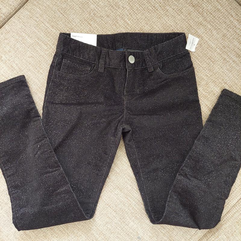 очень красивые, черный тонкий микровельвет с серебряным напылением. тянутся. 7 лет потому что наборы, но смотрите замеры: пояс 28 ( есть утяжка), длина 75, посадка 16.5/21