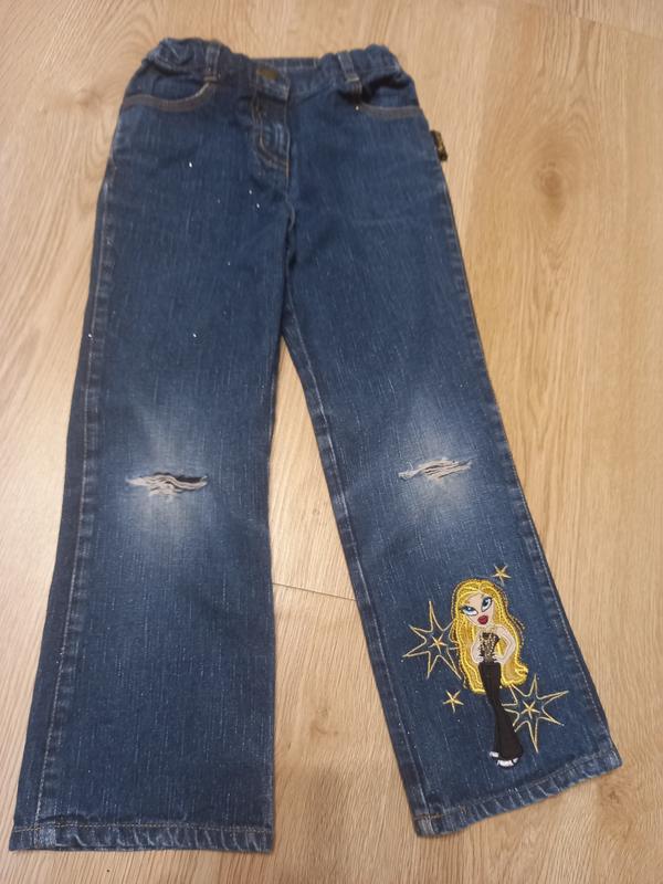 Модные джинсы для девочки, 4-6 лет, BRATZ, мягкий деним покрыт едва заметными блестками, колени с потертостями, Длина 62 см, шаг 42 см, ПОТ 25см, + - регулируется резинкой. ПОБ 34 см, штанина прямого крою, ледь розширена до низу.