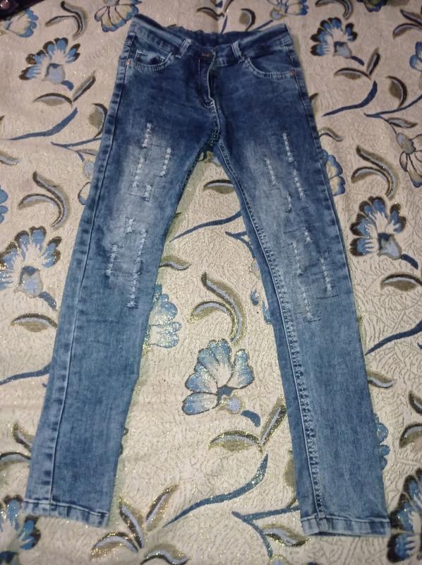 Джинсы skinny голубого цвета, подростковые на 10-11 лет. Длина - 82см, объем в поясе - 30см (имеется регулировка в поясе) Никаких повреждений и дефектов нет!