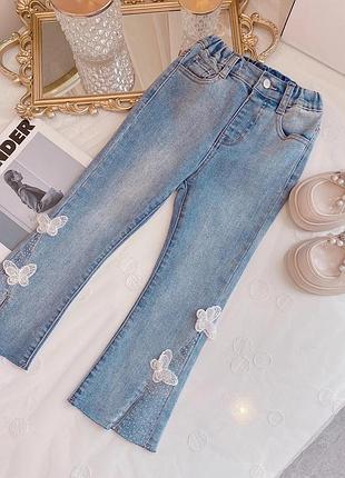 Модні джинси кльош Пояс резинка-добре тягнеться Низ оброблений стразами і метелик з жемчужиной 🔹Плотний якісний 100 % джинс. Відмінна якість! Замір 110-5шт довжина 60 шаг 37 120-3 шт довжина 65 шаг 41 130-2 шт-довжина 72 шаг 47 140-5 шт довжина 77 шаг 52 150-6 шт довжина 85 шаг 57
