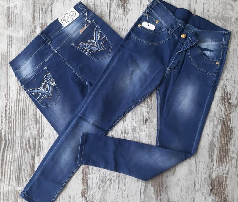 Джинси для дівчинки. Пояс на пластиковій блискавці та ґудзику. Спереду напівкруглі кишені, ззаду накладні декоровані стразами. Туреччина. Розмір: 📌13 років: пояс 37 см, довжина 88 см, крок 63 см. 📌15 років: пояс 38 см, довжина 92 см, крок 68 см.