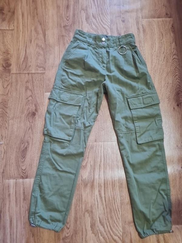 Карго,хорошая плотная ткань.По низу стягиваются, пояс на резинке. Одеты один раз.
