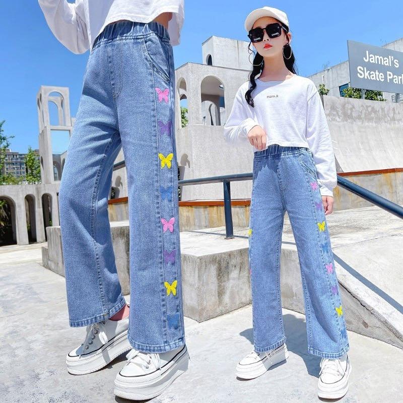Стильные джинсы для девочки 👍🏻 С разноцветными бабочками🦋 Пояс на резинке. Очень круто смотрятся на детках 😍 Удобные и качественные 💥💫 120 - длина - 70 см, крок- 46 см, бедра 37 см(2 шт) 150 - длина - 85 см, крок- 57 см, бедра 42 см(1 шт)