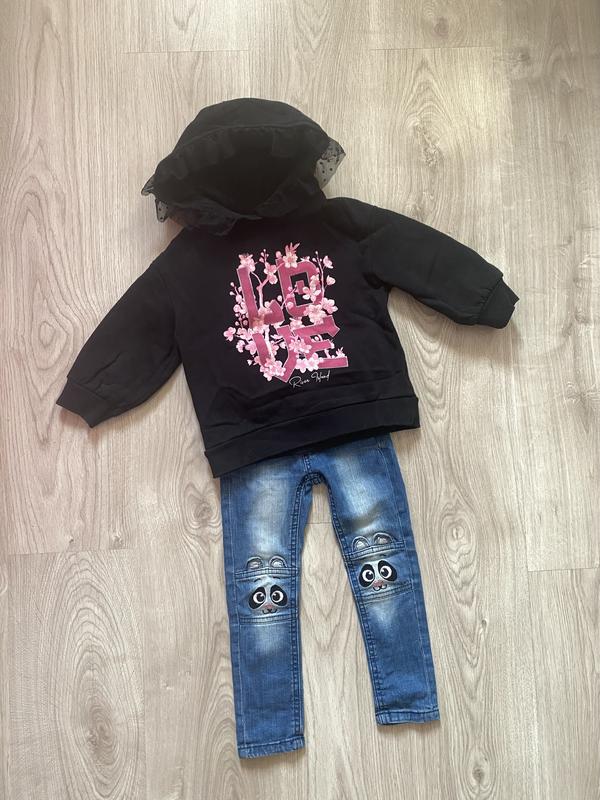 Набір: джинси і худі на флісі Стан дуже гарний( з недоліків, на джинсах по спинці стала слабка резинка ) Розмір 98-104, світшот маломірить на 98, а джинси навпаки будуть до 104