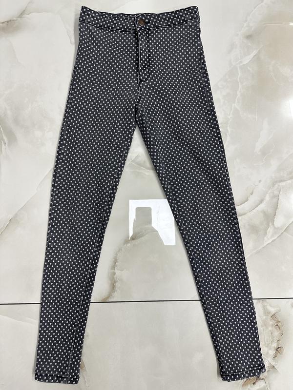 Классные скинни в горошек в отличном состоянии. Размер 13/14 лет, 164см. Замеры: длина 90см, шаг 67см, посадка 24см, пот 28см, поб 36см, ширина штанины внизу 11см. Джинс тянется.