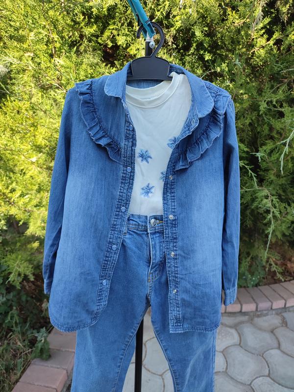 Продам разом джинси і рубашку. Фирма синтей, состояние идеальное, хорошо сочетаются между собой. Ткань джинсов очень качественная, плотные. Рубашка тонкий джинс, качественный. Состояние новых вещей. Біла кофта в комплект не входить, сфоткано для краси. Замеры: длина брюк 70см шаговой 52см длина рубашки по спинке 51см рукав 43 см
