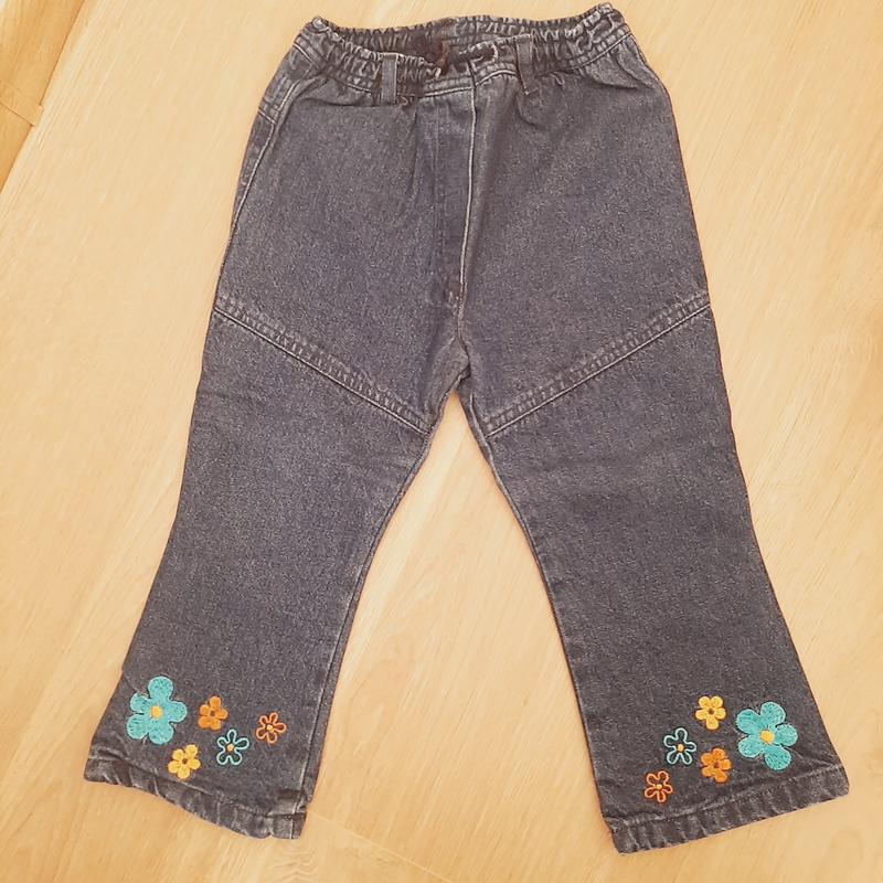 На 2,5-3 р, джинсы на подкладке, пояс на резинке, длина 56 см, обхват талии 52 см