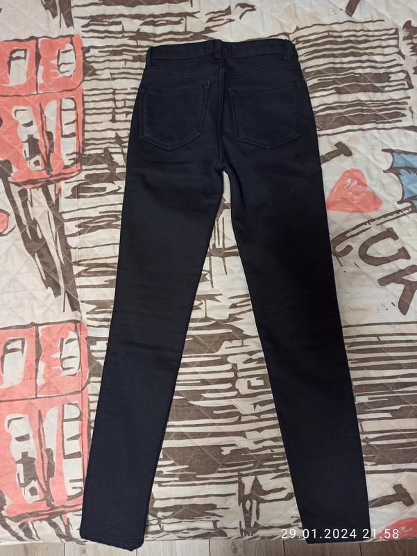 Джинсы стрейчевые утепленные для девочки. Новые. С обеих сторон бело - золотое переплетено вшиву. Карманы спереди, 2 сзади. Длина сверху 95 см, обхват по талии 65 см, в бедрах 83см.