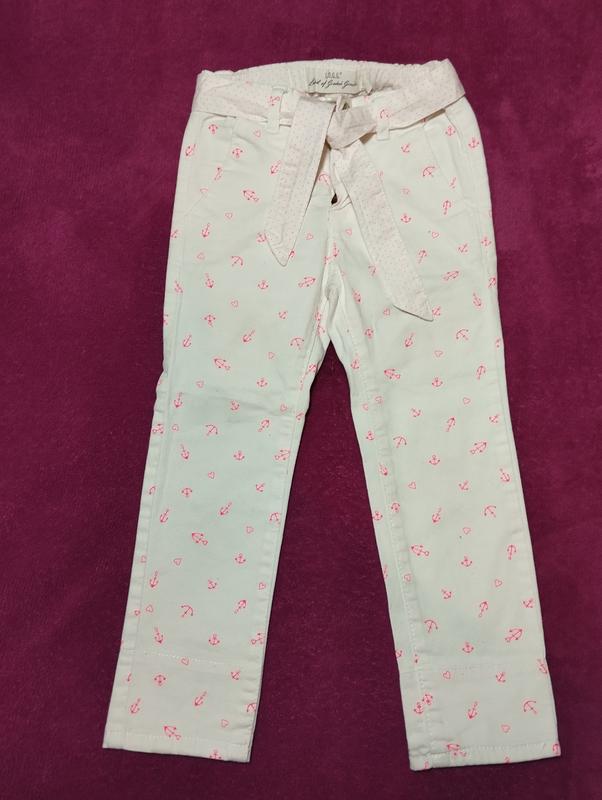 Джинсы Н&М для девочки, р.98. ( это 2-3 года) Цвет белый с розовым принтом. На талии поясок.Внизу манжет,которым можно регулировать длинну джинс.Состояние отличное.